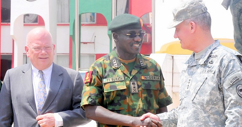 PIC.23. FROM LEFT: U.S AMBASSADOR TO NIGERIA, AMB. JAMES ENTWISTLE; CHIEF OF AMRY STAFF, LT.-GEN. TUKUR BURATAI AND COMMANDER, US AFRICOM. GEN. DAVID RODRIGUEZ, AT THE INAUGURATION OF UNITED STATES OF AMERICA TRAINING ASSISTANCE TO SELECTED UNITS OF THE NIGERIAN ARMY, IN JAJI KADUNA