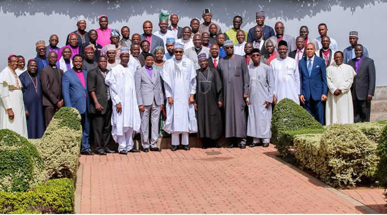 President Muhammadu Buhari who had earlier met with members of the Christian Association of Nigeria from 19 northern states and Abuja inside the Council Chambers posed for a group photograph with his guests at a raised platform at the forecourt of the Presidential Villa.