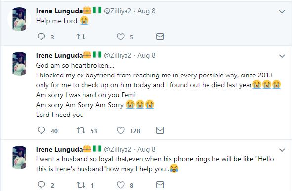 A Nigerian lady, Irene Lunguda is feeling guilty and heartbroken after she discovered that her ex-boyfriend whom she blocked from reaching her in every possible way since 2013, died in 2017.