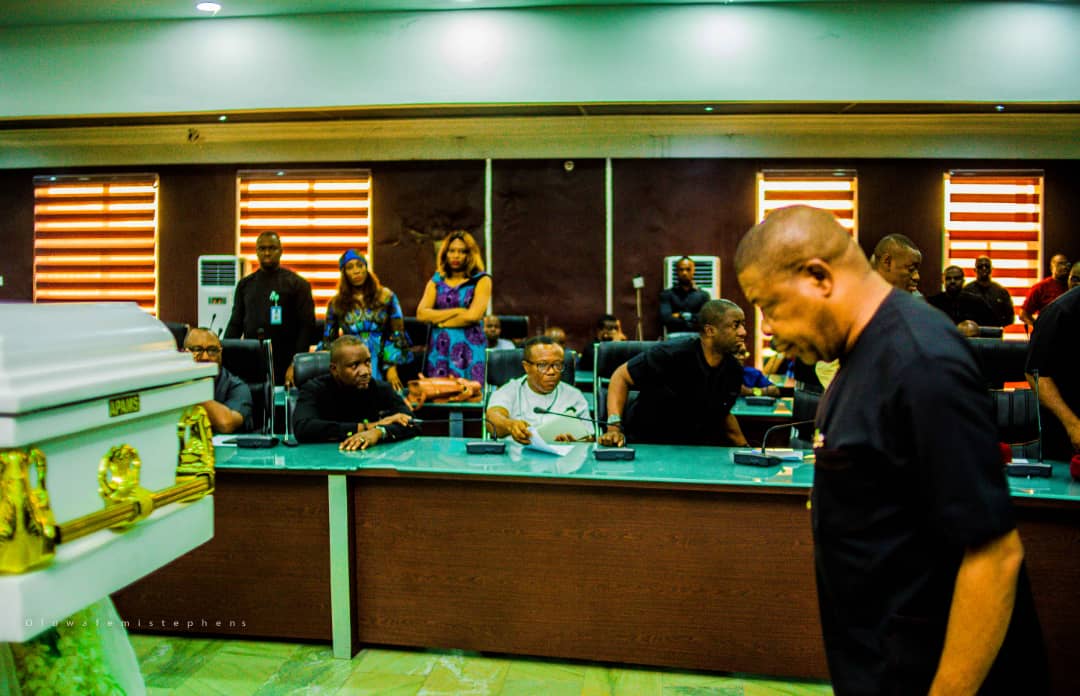 The government in a statement clarified that the picture was taken on Friday, December 20 2019, when the then-governor received the body of his departed commissioner for environment, Late Hon. Tony Okere, at the council chambers.