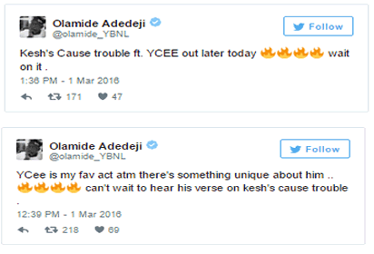 Lil Kesh’s new single titled “Cause Trouble” featuring YCee is another jam one can credit YCee for. Check out Olamide’s tweets below;
