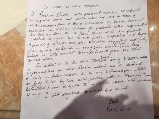 At this point, I have asked my attorney and applicable law enforcement agencies to assist in recovering my stolen funds.I will not make anymore comments on this regardless of what her family says.Everyone who works for me personally or my company enjoys the luxury I have put in place for me, most people have been in a bad situation before but it’s worst when a family you helped decides to abuse of your kindness.I gave Pearl’s mom the option of trying to get this boy to get the funds or let pearl get arrested and deal with her problems as an adult and her mom said they will come up with the money but the next thing that followed was the police at my door saying I kidnapped Pearl.I live in a gated community with security and Pearl was free to do what she wanted to do,Pearl packed her bags to leave and after we went through it we still found my property she stole and other things she had stolen from her previous trip to la in 2015. I trusted Miss Chuks with this money because we were going to use these funds down in Nigeria to setup Rodeodrng store and since I travelled often back and fourth to Africa I didn’t think it was necessary I get the money from Nigeria to America.I should have known she had plans when she asked my house keeper Martha if I had Cameras around my house of which Martha told her We did.