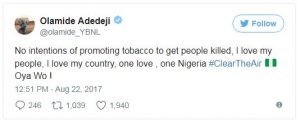 YBNL boss, Olamide has reacted to the airplay ban NBC (National Broadcasting Commission) placed on his new hit, ‘Wo’.According to him, he has no intention of promoting tobacco to get people killed with his music.