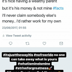 Paddy noted via his twitter page that although it’s nice to have a wealthy father, that money belongs to the actual owner (Mike) and not him.
