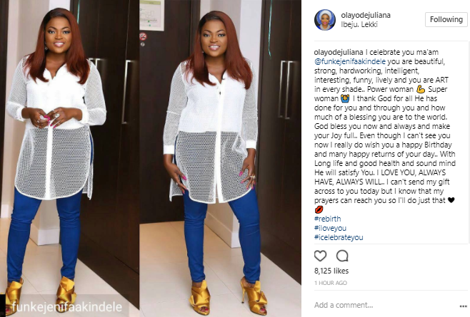 I celebrate you ma’am @funkejenifaakindele you are beautiful, strong, hardworking, intelligent, interesting, funny, lively and you are ART in every shade.. Power woman, Super woman. I thank God for all He has done for you and through you and how much of a blessing you are to the world. God bless you now and always and make your Joy full.. Even though I can’t see you now I really do wish you a happy Birthday and many happy returns of your day.. With Long life and good health and sound mind He will satisfy You. I LOVE YOU, ALWAYS HAVE, ALWAYS WILL.. I can’t send my gift across to you today but I know that my prayers can reach you so I’ll do just that