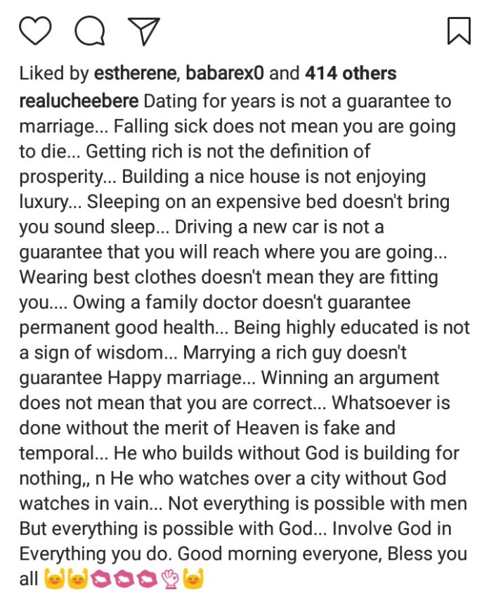 Agu took to her instagram page, earlier today, to give her 2cents to fans and friends following the increase in divorce rate and domestic violence.