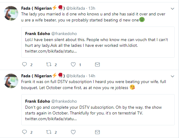 The Twitter user then called him ”over sabi” saying no one has access to any of the training camps In response, Frank said there is a tv series based on their preparation and he guesses GoTV doesn”t have it . Then the troll again calls the anchor a jobless wife beater, which Frank responded;