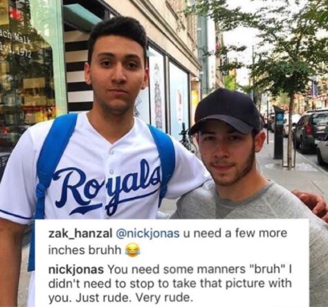A very angry Nick Jonas whose height is believed to be between 5’7″ and 5’9″ was totally pissed with the post and he responded swiftly saying, ‘You need some manners ‘bruh, I didn’t need to stop to take that picture with you. Just rude. Very rude.”