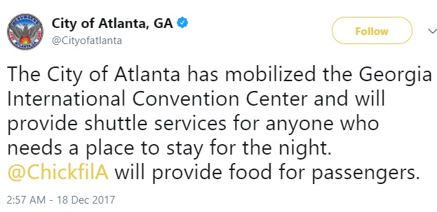 Passengers stranded and unable to fly were being taken to the Georgia International Convention Centre for the night.
