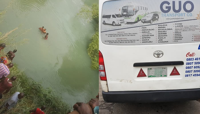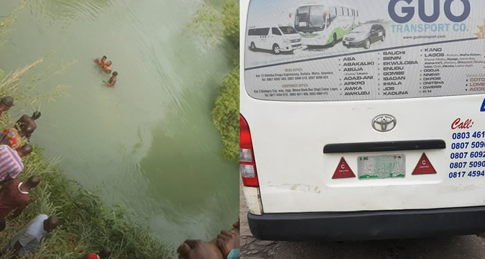 A GUO 18-seater bus was thrown into a river along the Agbor-Benin expressway on Friday. Two passengers were rescued by locals while the remaining 16 are feared dead.