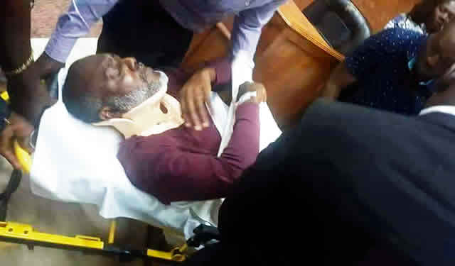 Olisa Metuh wore a neck brace as he lay on a wheeled stretcher. His body, from his legs to his chest, was covered with a white cloth with some unclear imprints.