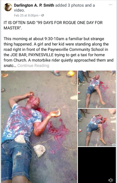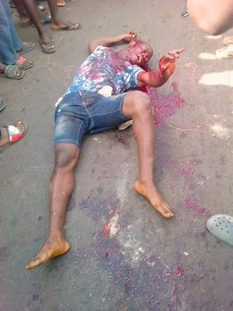 A suspected thief almost met his end after robbing a lady of her phone. According to a report by eyewitness, posted on Facebook, the man, on a motorcycle snatched a phone from a lady standing by the road with her child. Within few minutes, the thief fell off the bike and hit his head on the ground living him in a pool of blood.