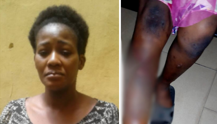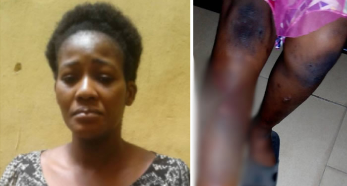 However, on Thursday 8 March, 2018, Nkeiru’s cup of iniquity got filled when she brought her children to a private school located somewhere in Ikeja, unfortunately for her, the prying eyes of other mothers who came to the same school to drop off their kids, noticed the gaping wounds on the upper and lower limbs of the victim who accompanied the suspect to the school.