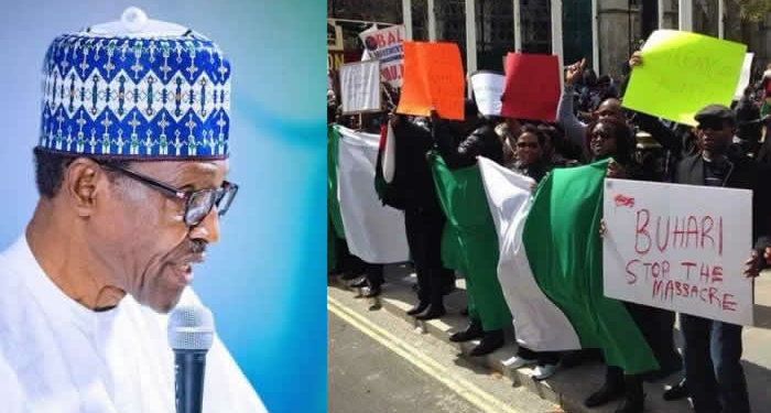 The protesters stormed the Abuja House in Kensington London, where the President is staying, blaming him for the nation’s ills.