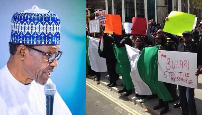 The protesters stormed the Abuja House in Kensington London, where the President is staying, blaming him for the nation’s ills.