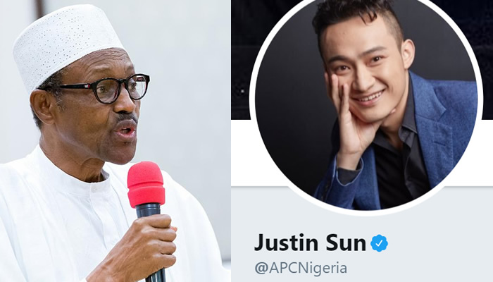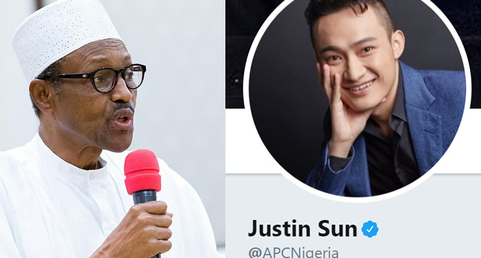 The official APC Twitter account seems to have been hacked but the person currently running the account goes by the name Justin Sun and he says, ‘The President of Nigeria sold me this even record, for 2k$, he said that he lacks money, and I agreed to buy his account with 700k followers, a good deal.