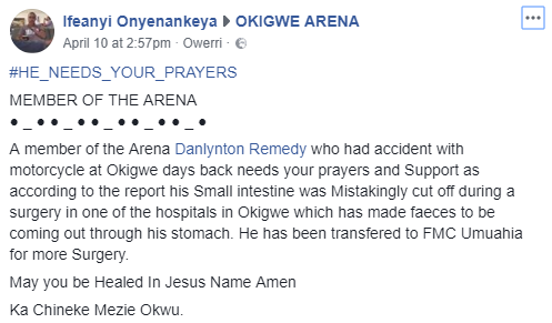 Danlynton Remedy was involved in a motorcycle accident and it left him with injuries on his stomach. He was taken to a hospital in Okigwe, Imo state, for treatment, but according to reports, a doctor mistakenly cut his small intestine during the surgery and that caused feces to run out of his stomach.