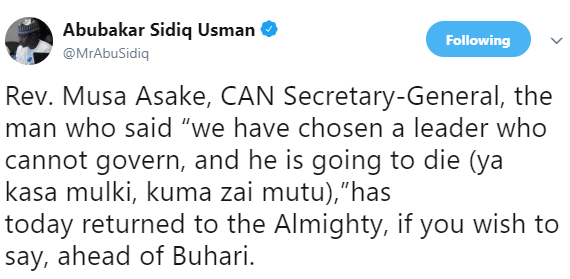 The secretary general of CAN, Dr Musa Asake died today after a brief illness. Twitter user @MrAbuSidiq who appears to be a pro-Buhari tweeted this in reaction to Asake’s passing.