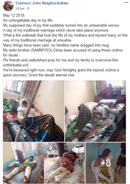 Ezemoro John Ifeaghochukwu said fire broke out after the accident and it killed his mother, one other, and injured many others. This led to the cancellation of his traditional marriage.