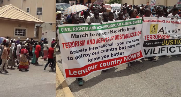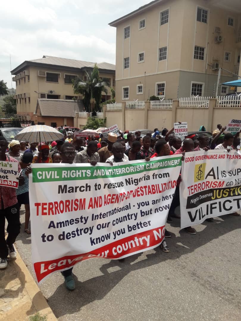 “The protest march of today is merely a rehearsal. It is the beginning of the occupation of Amnesty International until it gets out of our country. With the tenacity the NGO has shown in its bid to destroy Nigeria, we will not pull back like we did the last time its lies made us to occupy its premises. We have had enough of its destabilizing lies and we say Amnesty International must leave Now!”