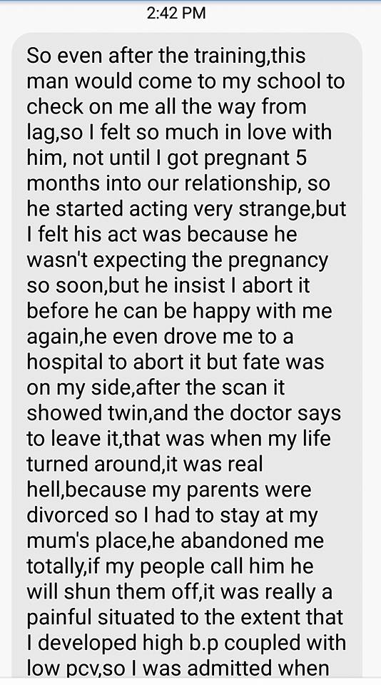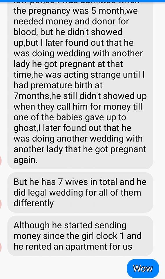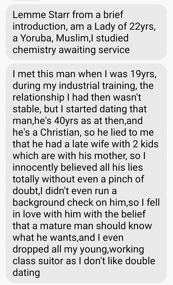 A 22-year-old lady has revealed what she passed through before and after she got pregnant for a married man with seven wives. According to the lady, she started dating the man when she was 19 years old (while the man was 40 years) after he allegedly lied and deceived her before she fell in love with him during her industrial training, I.T.