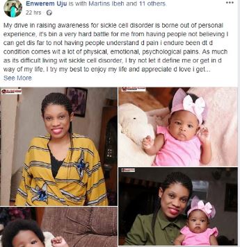 Enwerem Uju a Facebook user and Sickle Cell patient has taken to the social media platform to share her story, revealing how she defied all odds to become a mom.