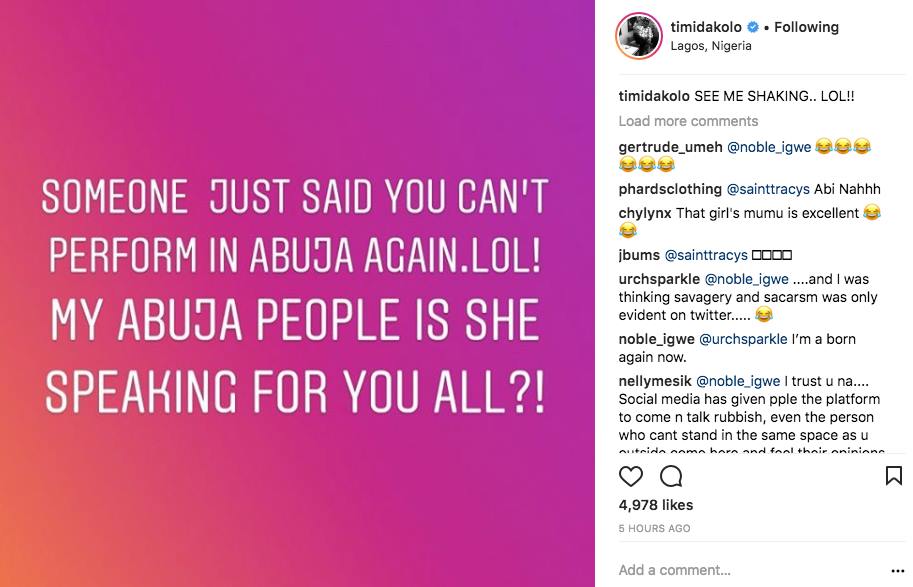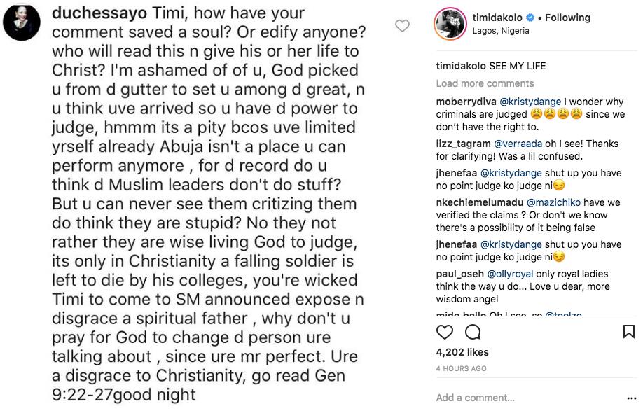 The insinuation from Timi did not sit well with a lady who called him out on Instagram with claims that he is a disgrace to Christianity for his posts.