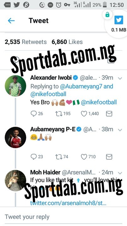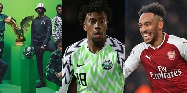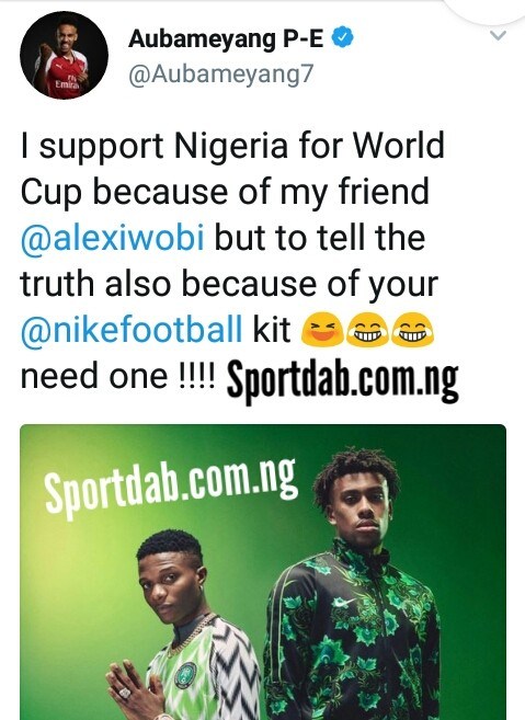 Arsenal striker, Pierre-Emerick Aubameyang has expressed his admiration for the Super Eagles jersey for the Russia 2018 world cup. In a tweet, he begged his fellow Gunners Alex Iwobi to save one for him.