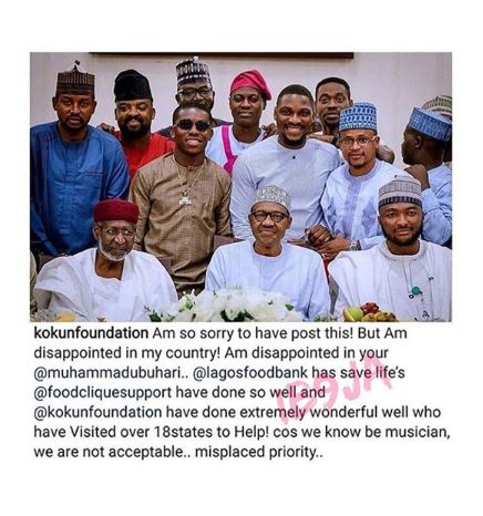 Kokun foundation took to his Instagram page to blast President Buhari for inviting celebrities to Aso rock instead of him. He feels he has done enough for the citizens for him not to be invited over for the feast.