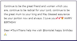 Yesterday, actress Toyin Aimakhu penned down a beautiful birthday message to actress Tonto Dikeh whom she stormed Abuja for to celebrate with.