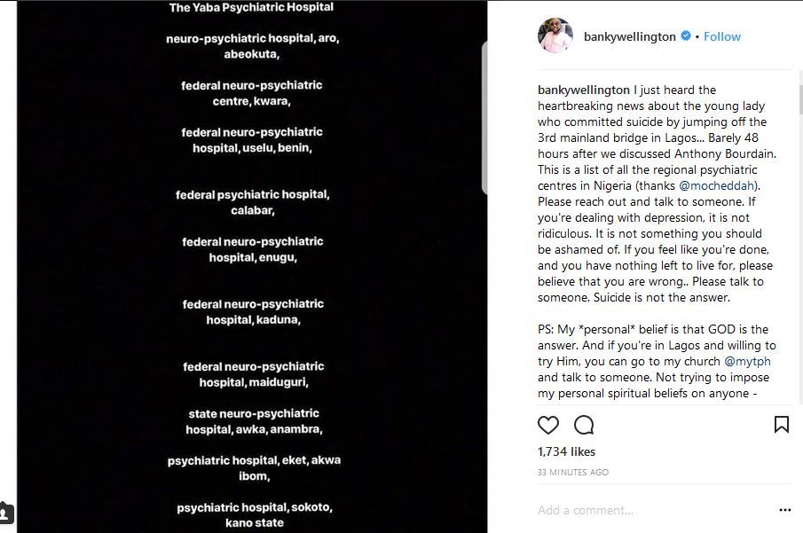 Actor and Musician Banky W has reacted to the numerous suicide reports that fills the news on a daily basis