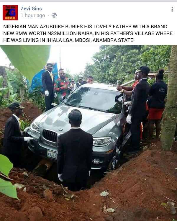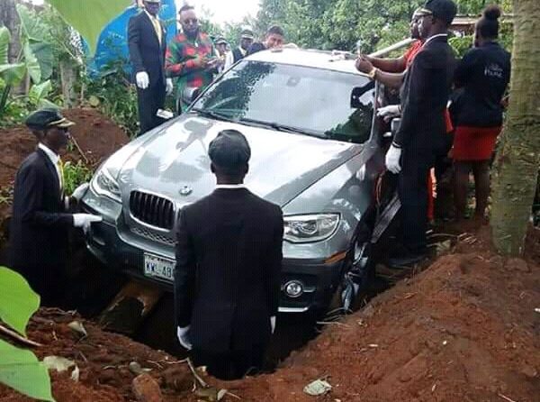 Report has it that a man from Anambra State in the Eastern part of Nigeria was buried in a N32million worth of BMW which was bought by his rich son who wanted to give his father a befitting burial.