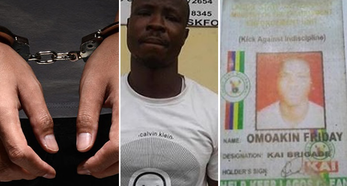 Operatives of the Lagos State Task Force, over the weekend, arrested a 35-year-old Togolese man identified as Friday Kojo around Ikeja railway line, for impersonation and extortion with a fake Lagos Environmental Sanitation Corps (LAGESC) identity card.