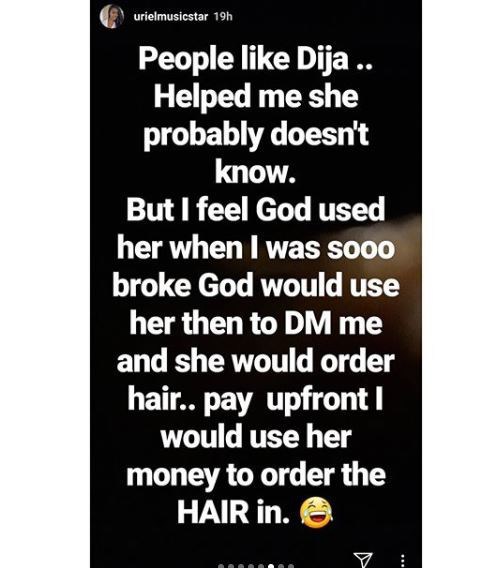 Ex- Big Brother Naija housemate, Uriel has shared a rare story of how God used Mavin singer, Dija to help her through her trying times.