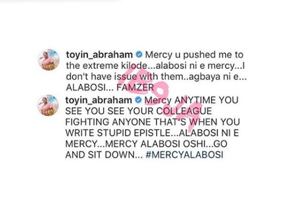 The drama started when Toyin Abraham took to Instagram and insinuated that Mercy Aigbe is often excited when colleagues have misunderstandings and is of the habit of fueling feuds silently while feigning ignorance.