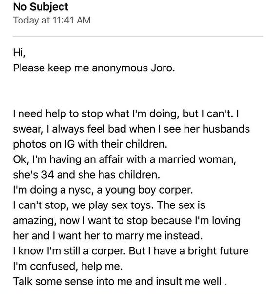 The young youth corper sleeping with an old woman who is 34 despite being married with kids is seeking advance on his feeling for her. Below is what he wrote to Joro Olumofin for advice..