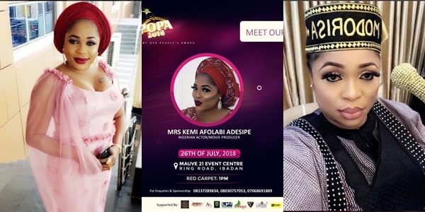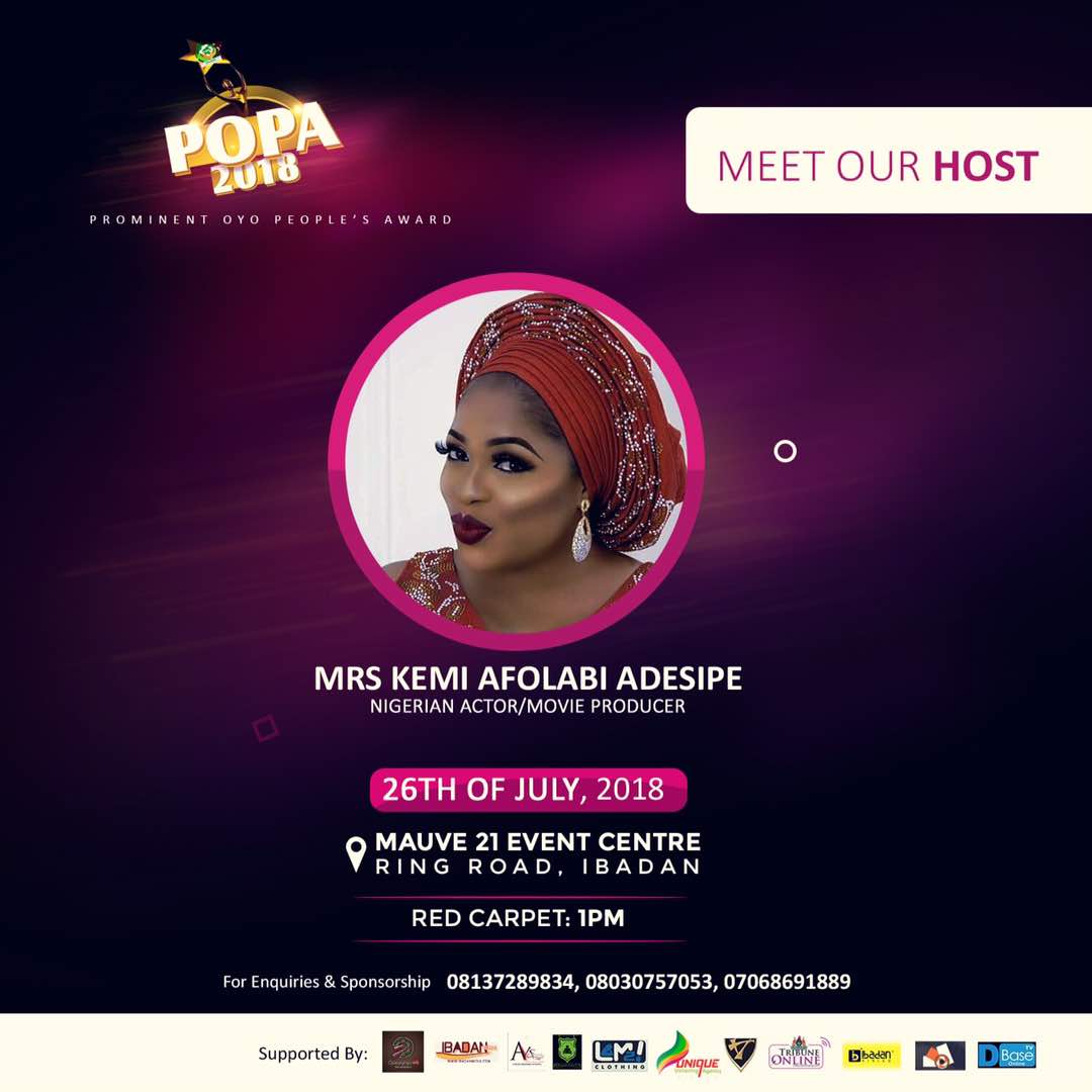 The organizers of the Prestigious Prominent Oyo People’s Awards {POPA} has unveiled Yoruba Actress, Kemi Afolabi as the host for the 2018 edition of the much talked about annual event.