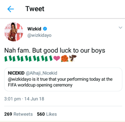 Wizkid denied the rumour but he was quick to wish the Super Eagles Goodluck.