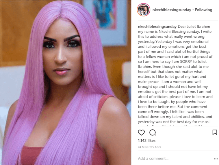 “Dear Juliet Ibrahim my name is Nkechi Blessing sunday. I write this to address what really went wrong yesterday,Yesterday I was very emotional and i allowed my emotions get the best part of me and I said alot of hurtful things to a fellow woman which i am not proud of so I am here to say I am SORRY to Juliet Ibrahim. Even though she said alot to me herself but that does not matter what matters is I like to let go of my hurt and make peace . I am a woman and well brought up and I should not have let my emotions get the best part of me. I am not afraid of criticism, please i love to learn and i love to be taught by people who have been there before me. But the comment came off wrongly. I felt like i was been talked down on my talent and abilities, and yesterday was not the best day for me as i was dealing with alot myself so all this added to me blowing off but this is not me making excuses but me making peace and correcting whatever wrong impression about me yesterday must have created in the minds of people. Once again i am sorry to everyone who I have disappointed by my actions. This are people that love and have great respect and expectations for me but I let them down. I should have acted differently. Also to juliet Ibrahim I am sorry and I Open my arms for love and peace I hope you will kindly embrace it. We are all women we should love and support each other not fight each other. Thank you all and have a blessed holiday…Cc @julietibrahim”