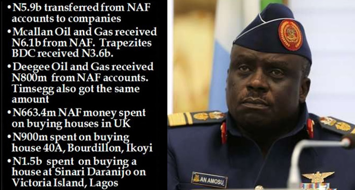 Amosu and Adigun were said to have, between July 17 and September 16, 2014, removed over N663.4million from the Nigerian Air Force accounts to purchase properties at 50-52 Tenterden Grove, London (NW4 1TH) and at 93B Shirehall Park, LondonNW4 2QU, United Kingdom.