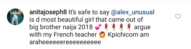 “It’s safe to say Alex is the most beautiful girl that came out of Big Brother Naija 2018. argue with my French teacher.”