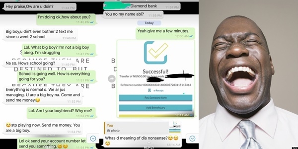 A Nigerian Man has taken to popular micro-blogging site, twitter to narrate how his friend sent the whooping sum of Fifty Naira (N50) to a girl who asked him for money.