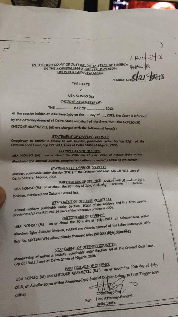 ” It will also interest the public to know that all criminal cases have been transferred from the State High Court of Akwukwu-Igbo to Asaba in Delta state apart from this case alone with case file No: AKU/13C/13 and charge number 0/21c/13.