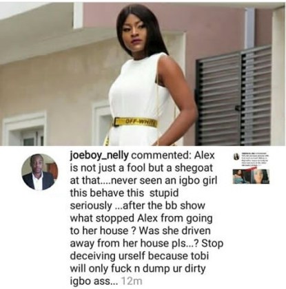 Alex is not just a fool but a shegoat at that….never seen an igbo girl this behave this stupid seriously …after the bb show what stopped Alex from going to her house ? Was she driven away from her house pls…? Stop deceiving urself because topi will only fuck n dump ur dirty igbo ass…