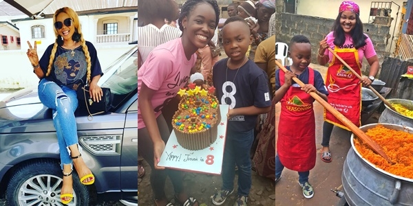 Yesterday was the 8th birthday ceremony of Mercy Aigbe,s son, Juwon. It was marked in a special way as both mom and son took to the kitchen to prepare food for the poor and needy.