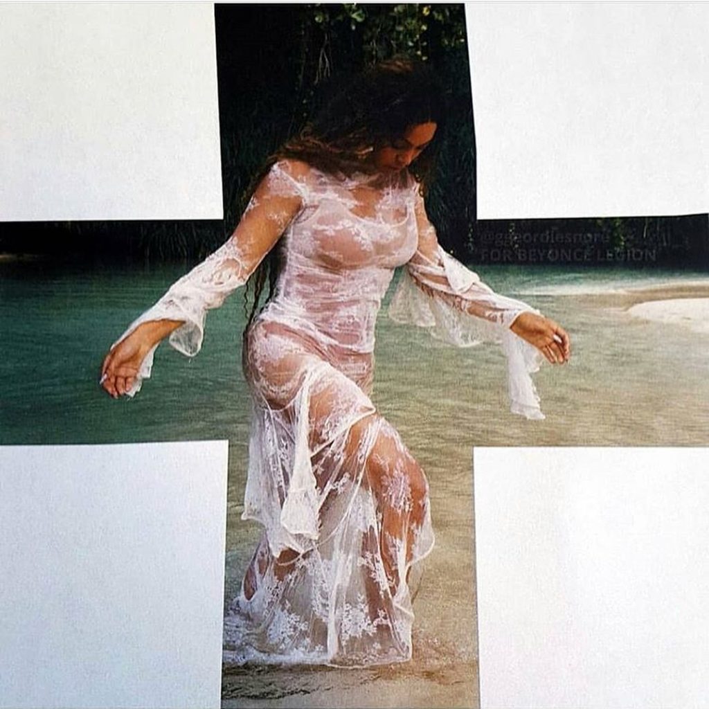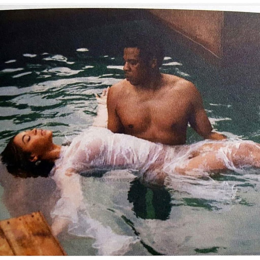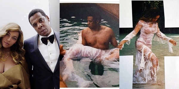 The images show Beyonce and Jay Z mimicking traditional Christian imagery. One of the images shows Beyonce dressed as if she were Jesus and there’s a cross around her, while the second image shows Jay Z as John The Baptist, baptizing Beyonce.