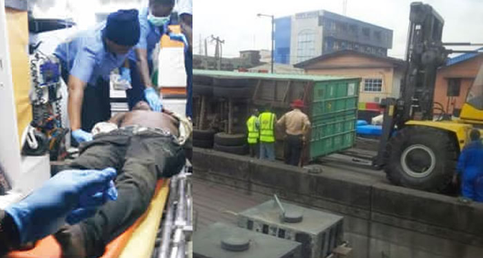 According to Eyewitness from Ojuelegba, there was another accident involving a container falling off the bridge and landing on cars. The incident happened around 8pm on Tuesday. A source at the scene said three commercial buses and a car belonging to the Lagos State University Teaching Hospital were trapped under the plywood.
