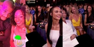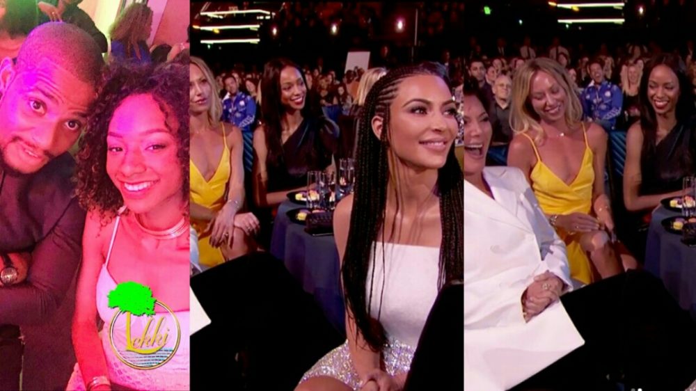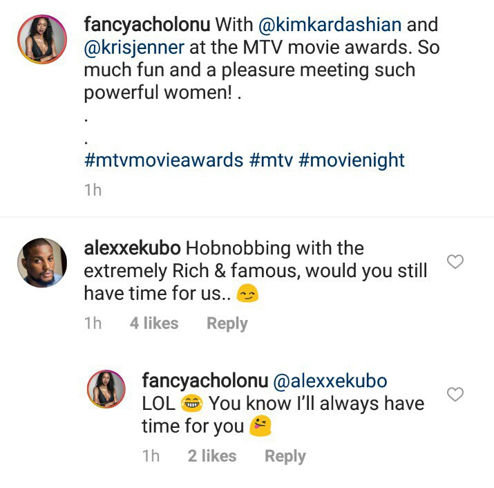 Nollywood actor, Alexx Ekubo filled with curiosity as he sees his girlfriend, Fancy Acholonu hobnobbing with American socialites Kim Kardashian and her mum, Kris Jenner at the 2018 MTV Movie & TV Awards.