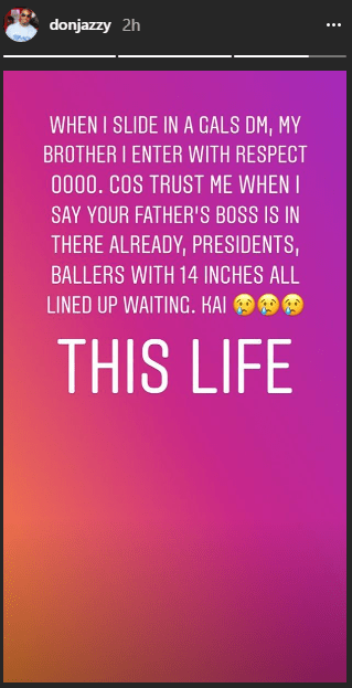 Nigerian music mogul and One of the oldest and most popular bachelors in Nigeria, Don Jazzy has revealed he respects himself when he enters a girl’s DM because he knows that people higher than him might also be messaging her.