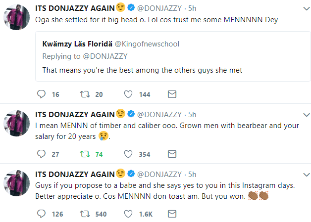 “Guys if you propose to a babe and she says yes to you in this Instagram days. Better appreciate o. Cos MENNNN don toast am. But you won. ????